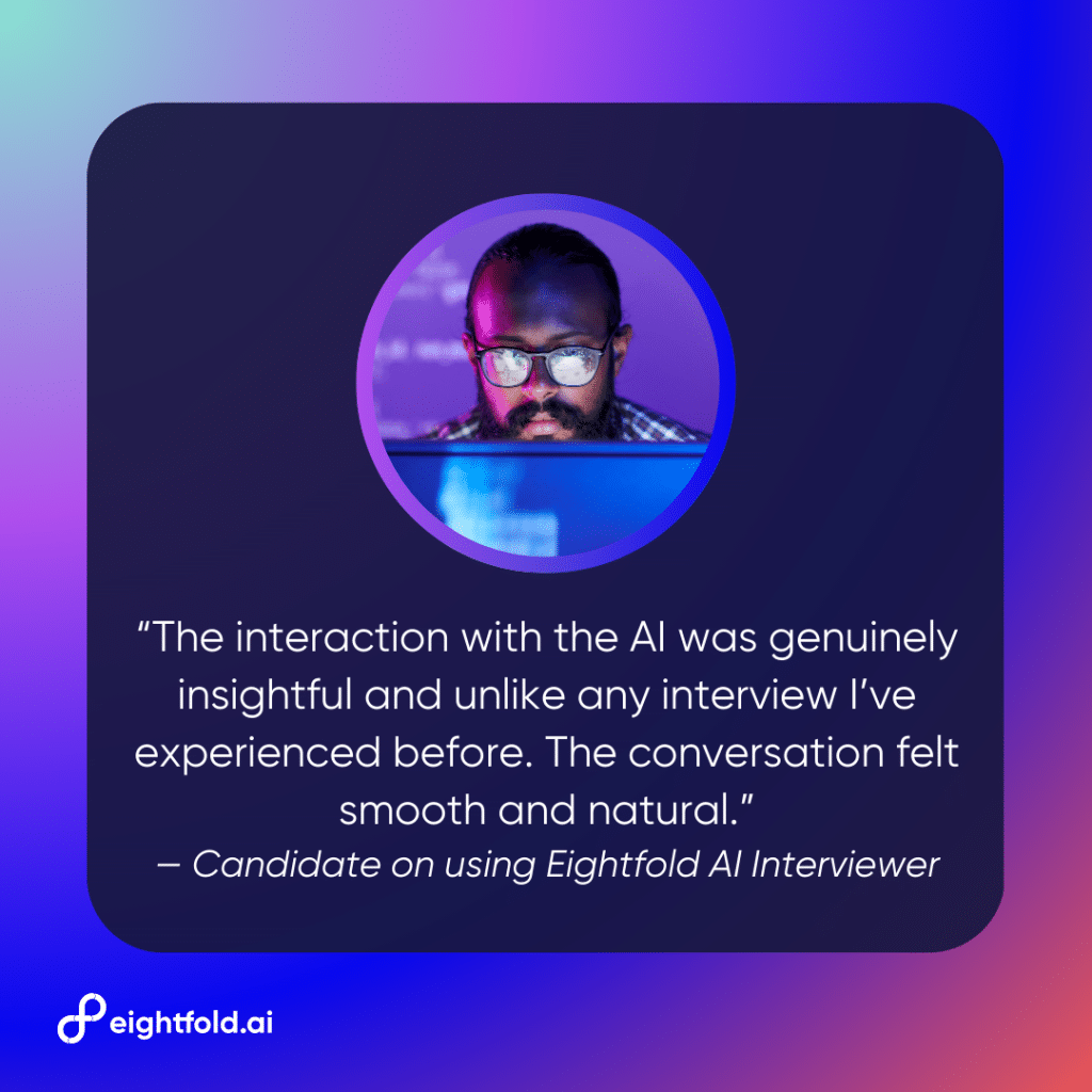 An AI voice agent is available 24/7. This means as soon as an application is screened, the candidate can be invited to interview right away, instead of waiting for a human recruiter to be free.