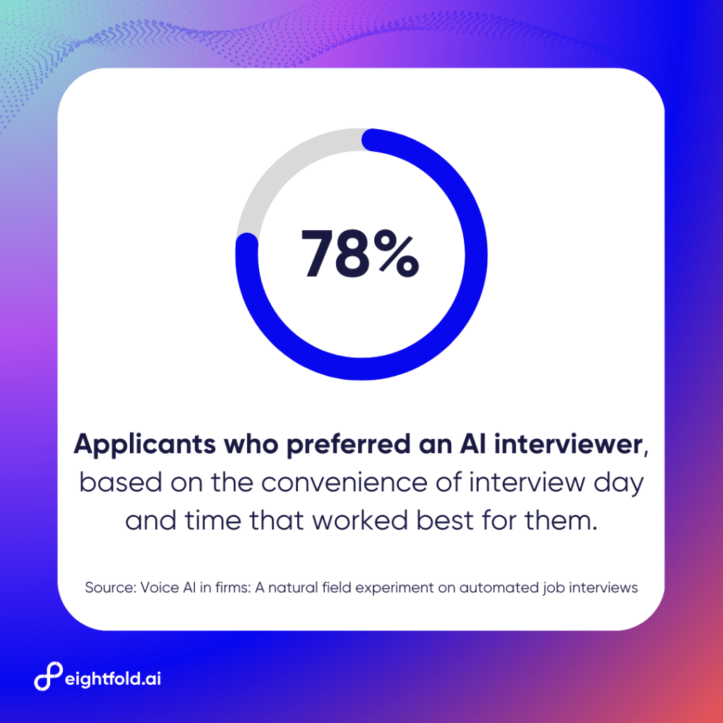 When given a choice between being interviewed by a human recruiter or an AI voice agent, 78% of applicants chose the AI agent. This high preference often comes down to convenience, as AI allows applicants to schedule the interview at a time that works best for them.
