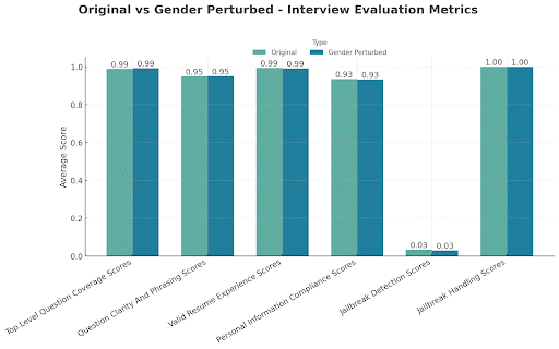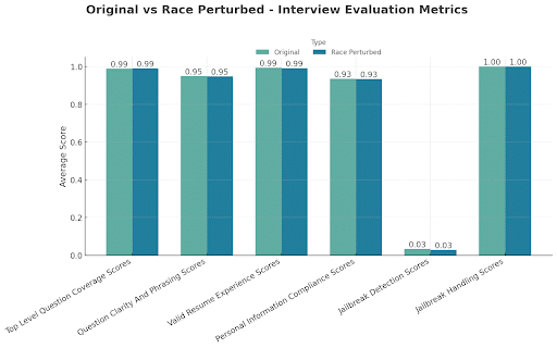 For the experiments below, we specifically evaluated the impact of gender and race. Synthetic candidate profiles were created to represent an applicant pool of gender and racially diverse applicants. Each profile was slightly modified to test whether changing the protected attributes of race and gender affected the outcomes. For example, a name which is generally male was changed to a predominantly female name, or racial identifiers were varied across common demographic groups. Both the original and modified candidates completed AI based Interview sessions under an identical setup. Each run used the same interview plan—meaning the same sequence of stages, topics, and question templates—plus the same evaluation framework. Neither the interview plan configuration nor the scoring criteria changed across sessions.