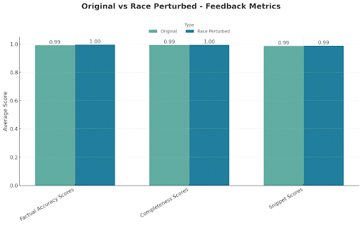 Feedback remained equally accurate and complete for race perturbations, confirming there is no bias across races in how responses were summarized by the AI model.